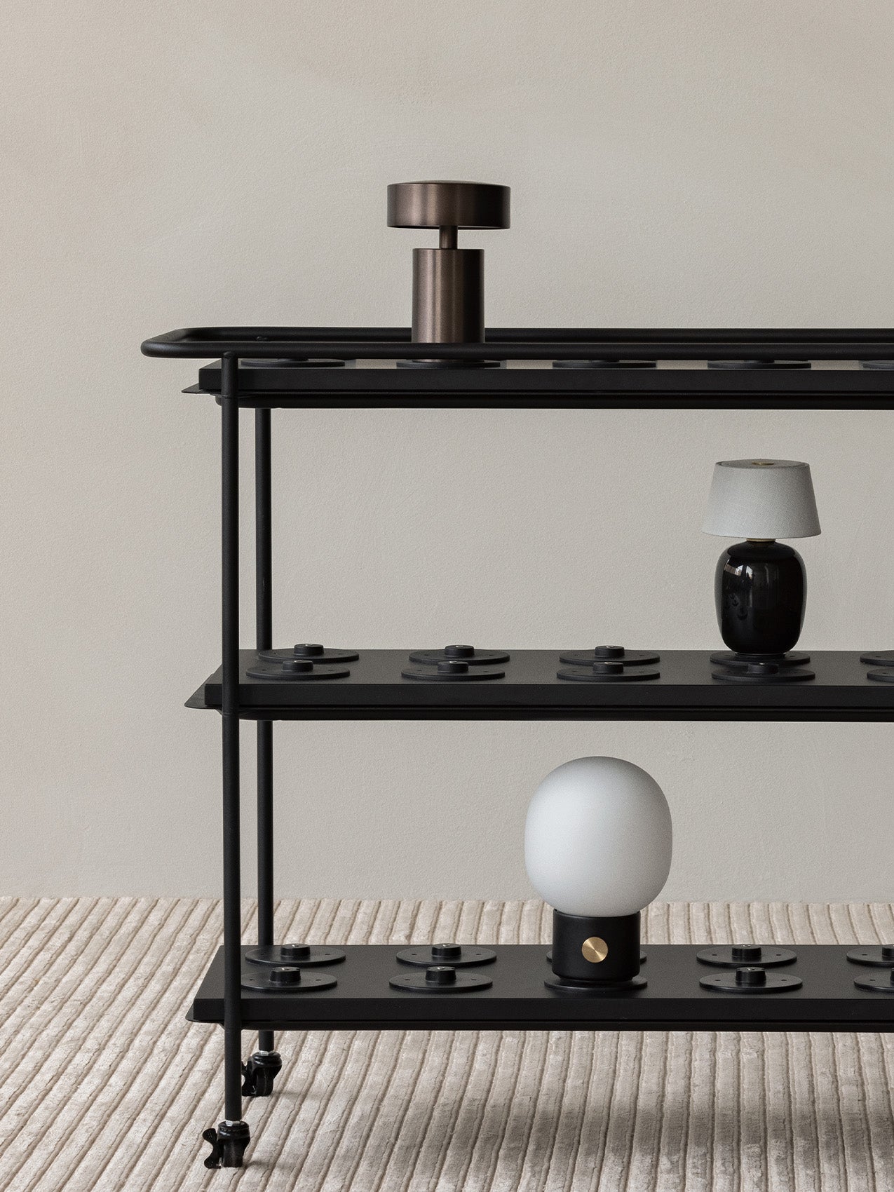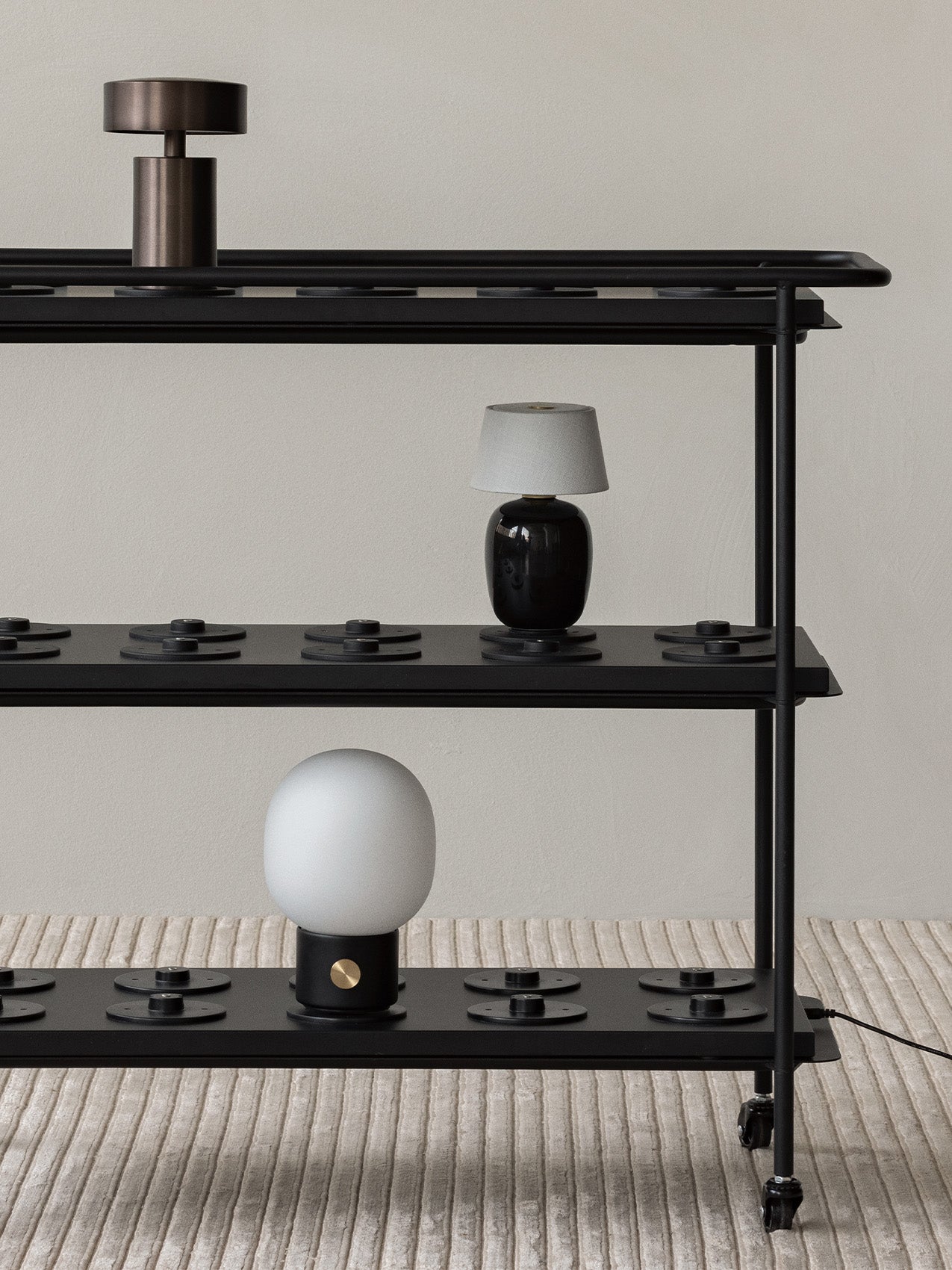 A smart and practical solution for our portable lamp designs, Charging Trolley is a handy design that takes the hassle out of charging multiple lamps. Ideal for hospitality environments or anywhere where time is of the essence, the powder-coated metal trolley holds three charging stations to provide a total of 30 charging sockets that can reanimate portable lamps in a single sitting. Comes without the Charging Boards.