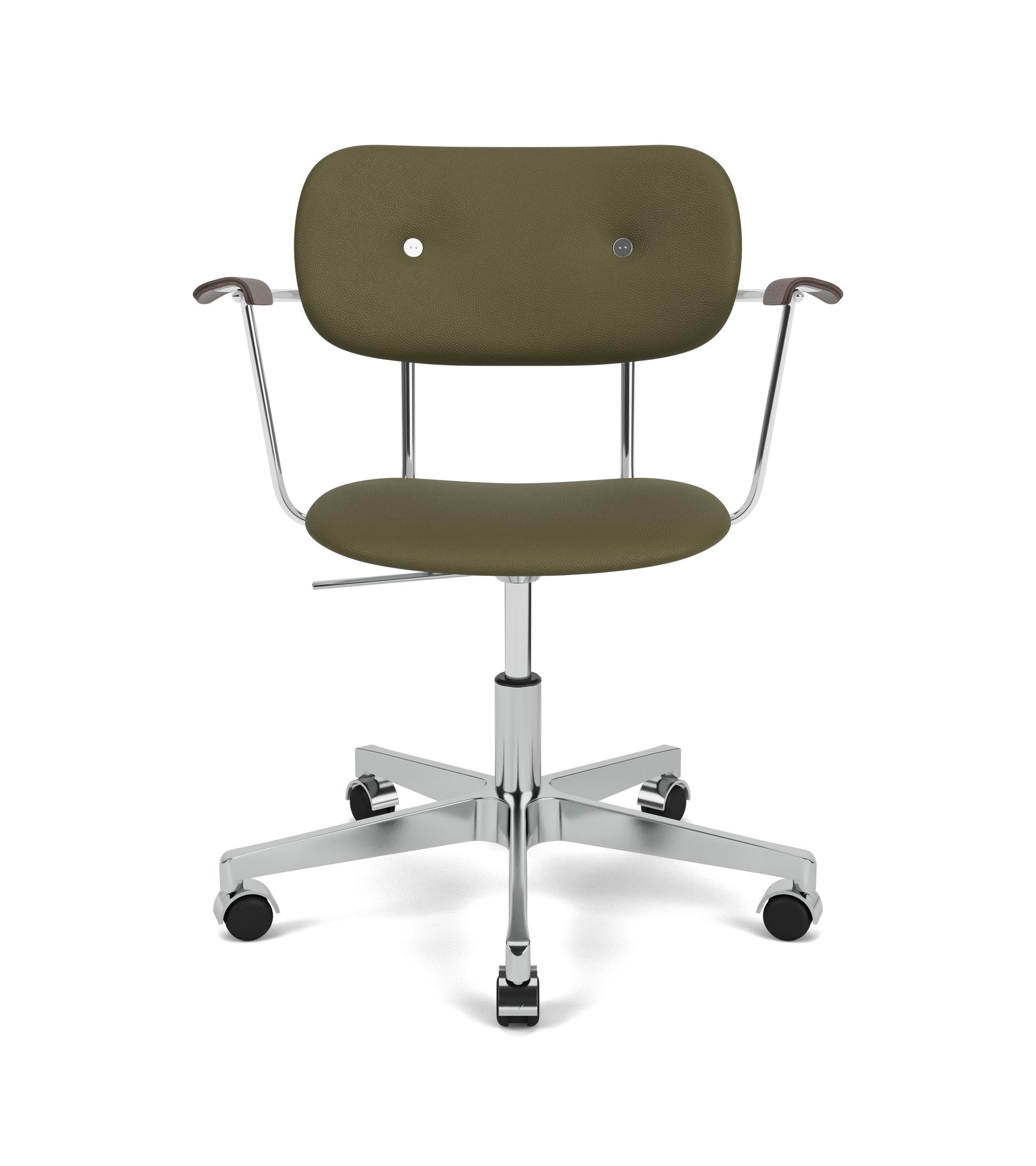 The Co Task Armchair seamlessly integrates sitting comfort and flexible function into its minimalist expression. Designed for a wide range of work settings and set on a five-star Chrome swivel base with casters, a height-adjustable feature ensures adaptability to workspaces and user preferences, promoting ergonomic comfort for users of different heights. Together with supportive armrests and an upholstered seat and back, a flex tilt function enhances comfort, allowing for adjustment to the preferred seating position for optimal support during extended periods of use.