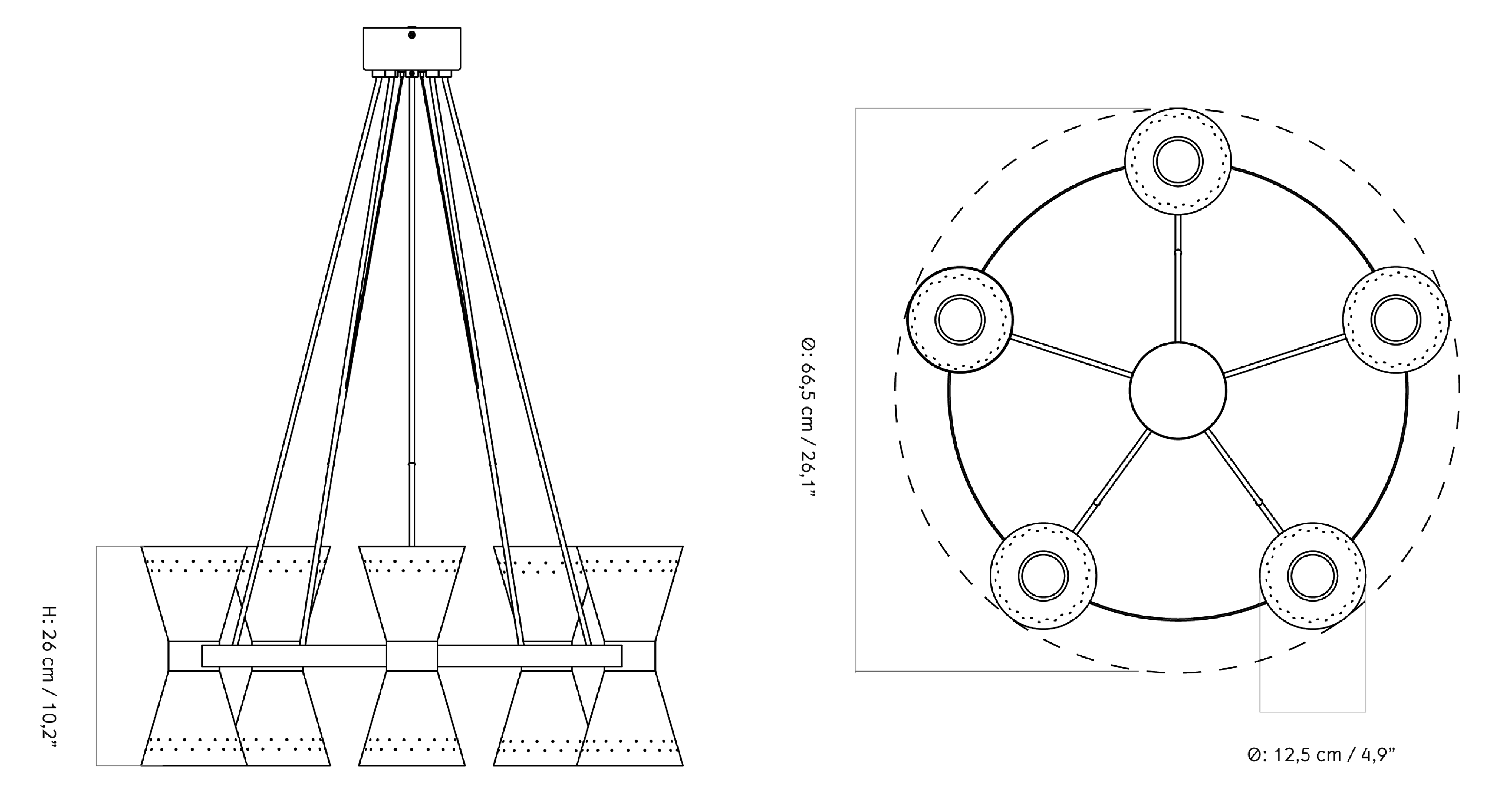 One of three light fixtures created in the 1950s by Swedish designer Alf Svensson, the Chandelier 5 presents a statement-making mid-century aesthetic. Its band of solid brass holds ten geometric metal shades which direct light both upward and downward. Small perforations in the shades allow further light to shine through. Its timeless look, typical of the Scandinavian Modern period in which it was designed, lends itself to any setting, making it equally at home as an illuminating feature in a public or private space.