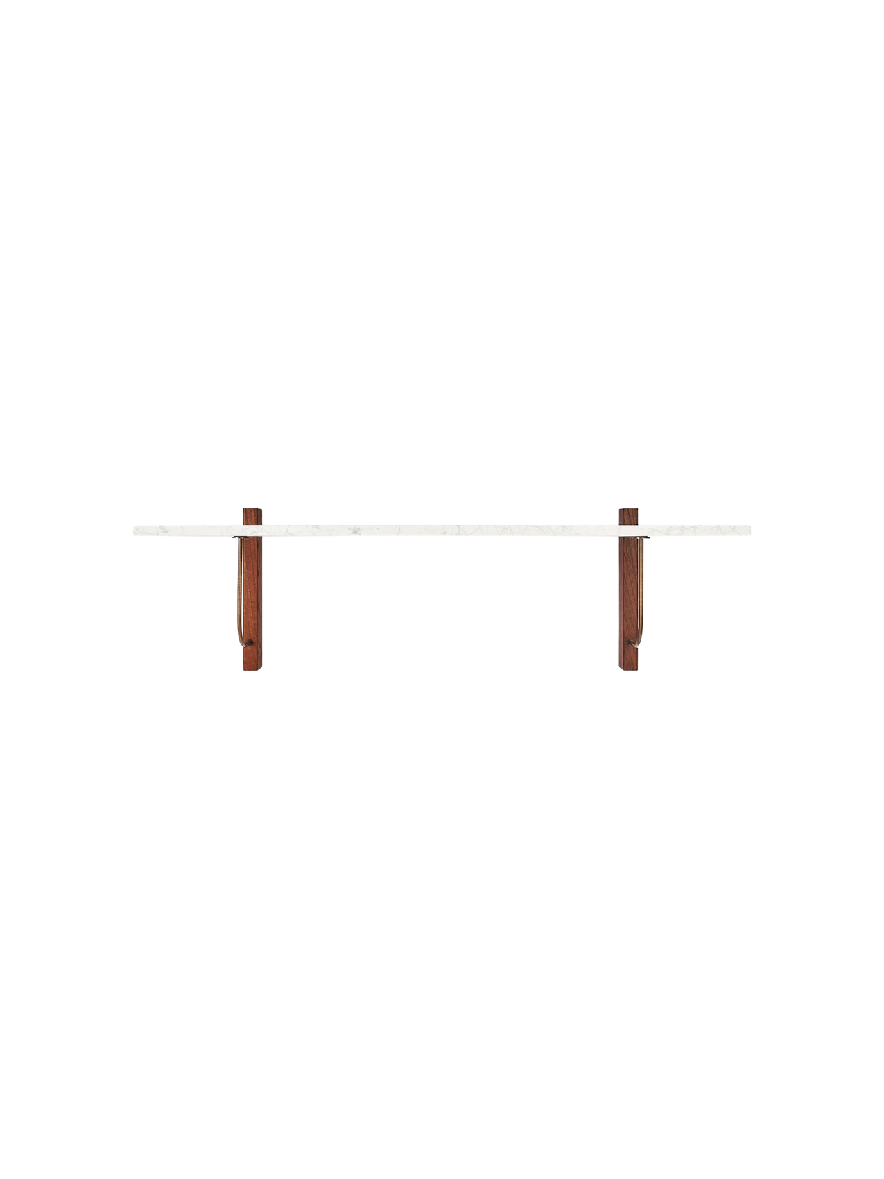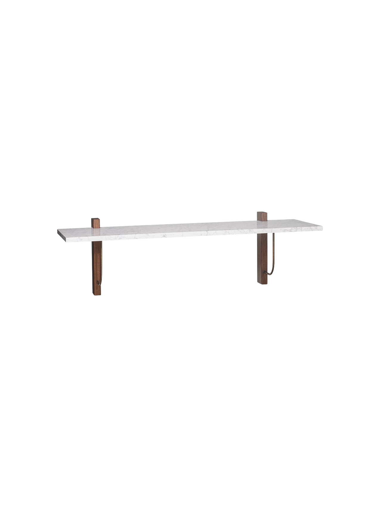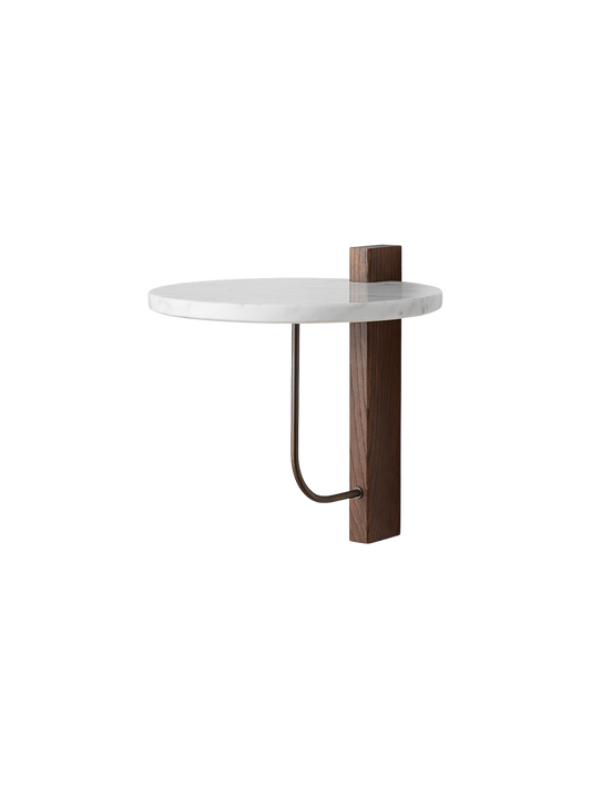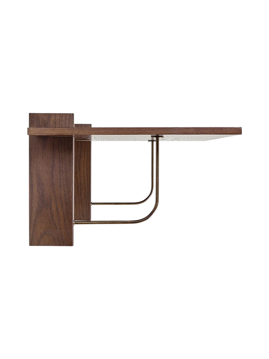 The Corbel Shelf takes its name and design cues from architectural weight-bearing brackets traditionally made from stone or wood. Designed for versatility, it serves a range of different purposes and needs in dining, kitchen and living room areas, maximising the utility of a space and infusing the design with a sense of structural elegance. The shelf can also be paired with the corresponding desk to create a minimalist home office. thoughtfully crafted to maintain a clean and decluttered aesthetic. The small distance to the wall allows for neat cord management. The wall-mounted design is offered in marble or dark-stained oak with dark-stained oak and bronzed steel brackets, catering to different interior styles and preferences.