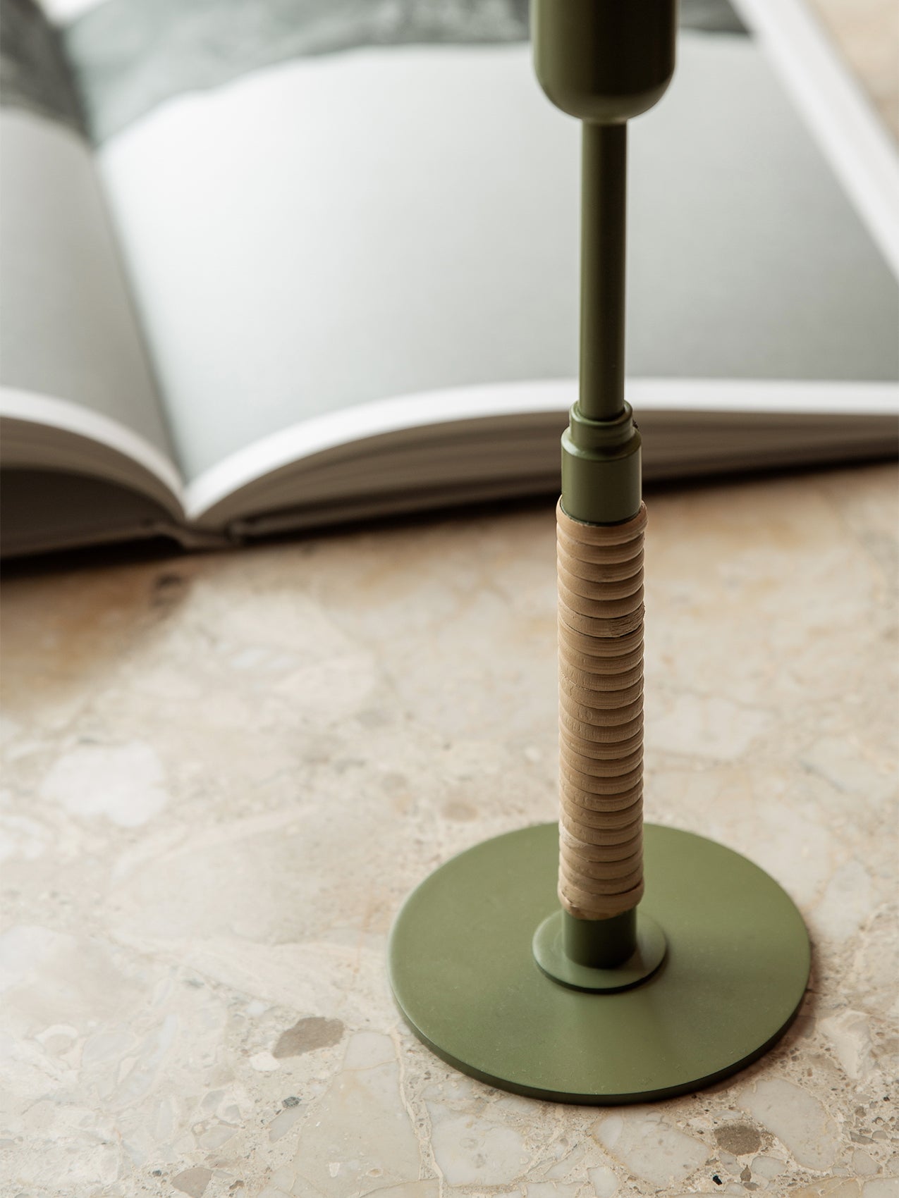 Set on a circular base and stem in polished or bronzed solid brass, the Duca candle holder is detailed with rattan around its stem. A small screw on the side of the design allows the user to adjust the height – extending or shortening the