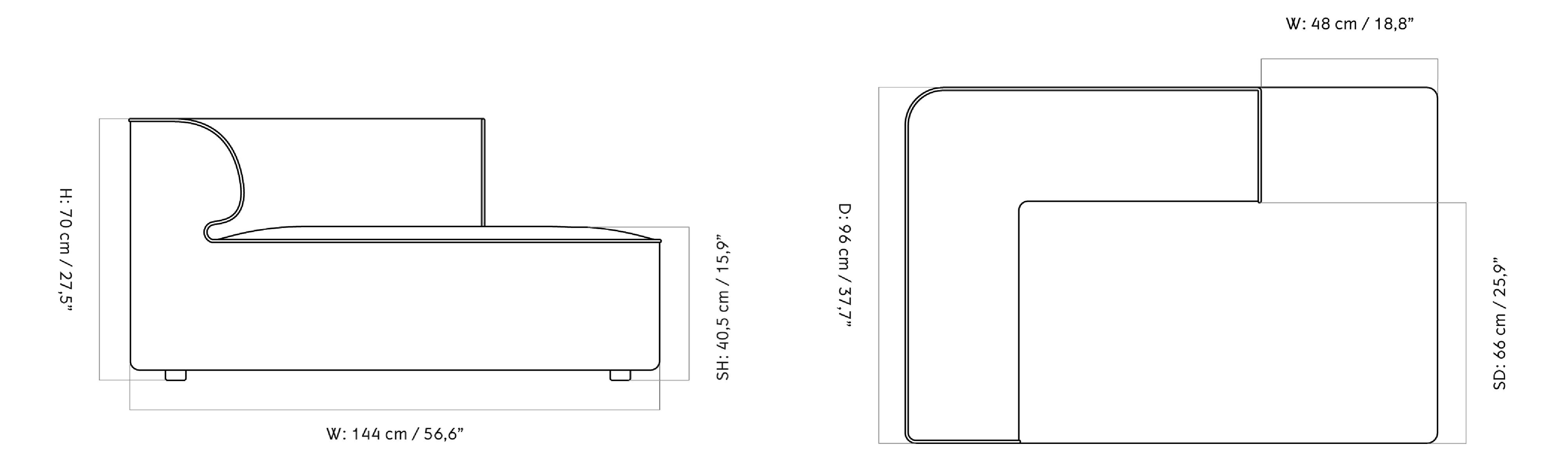 A shorter design ideal for more compact spaces, this chaise longue module features extra deep seats for comfort and the collection’s characteristic curves.