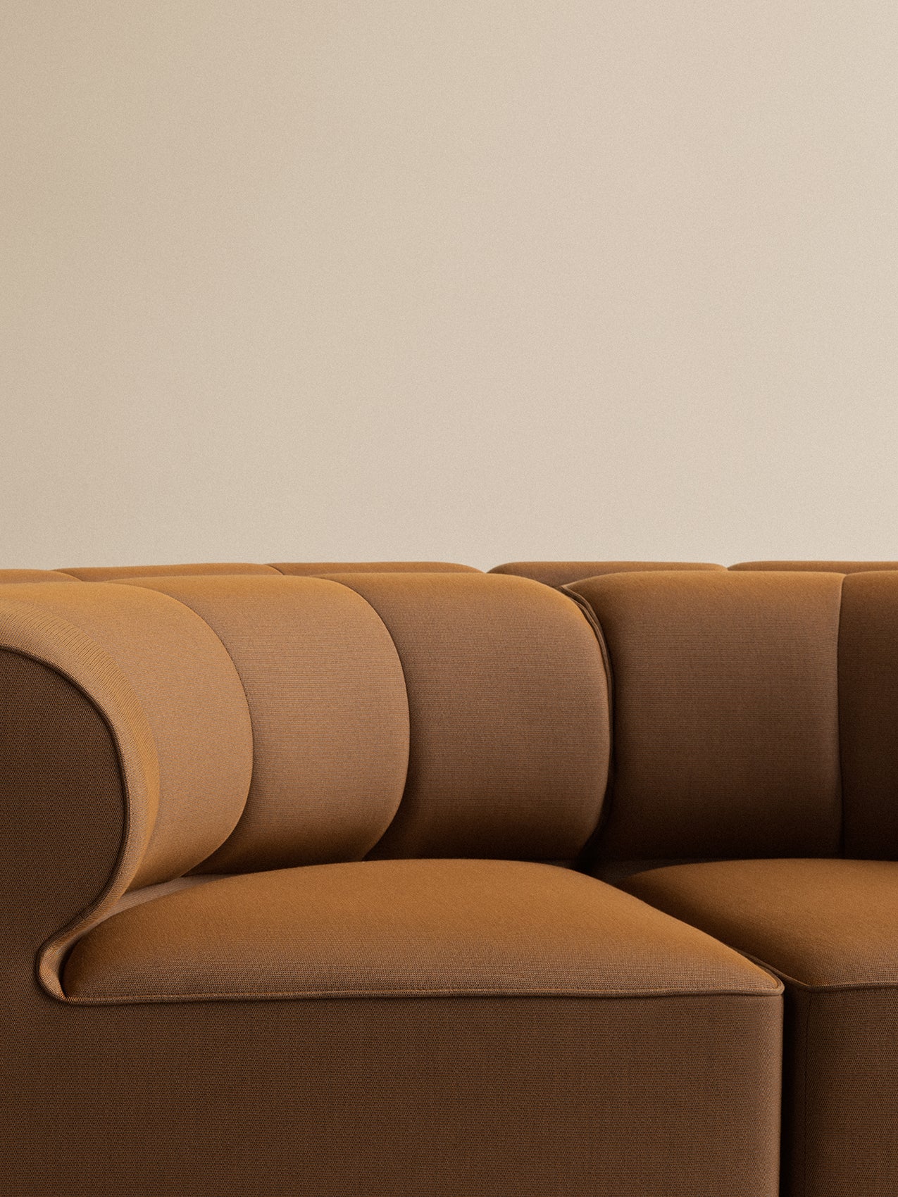 With its characteristic triangular profile and rounded back, the concave corner module of the Eave Seamline series lets you create a sectional sofa with an embracing form. This module seamlessly integrates with others from the series; its clean, neutral look is injected with subtle touches of personality in the form of stitch details and concave and convex forms that provide comfort and support when sitting our lounging.