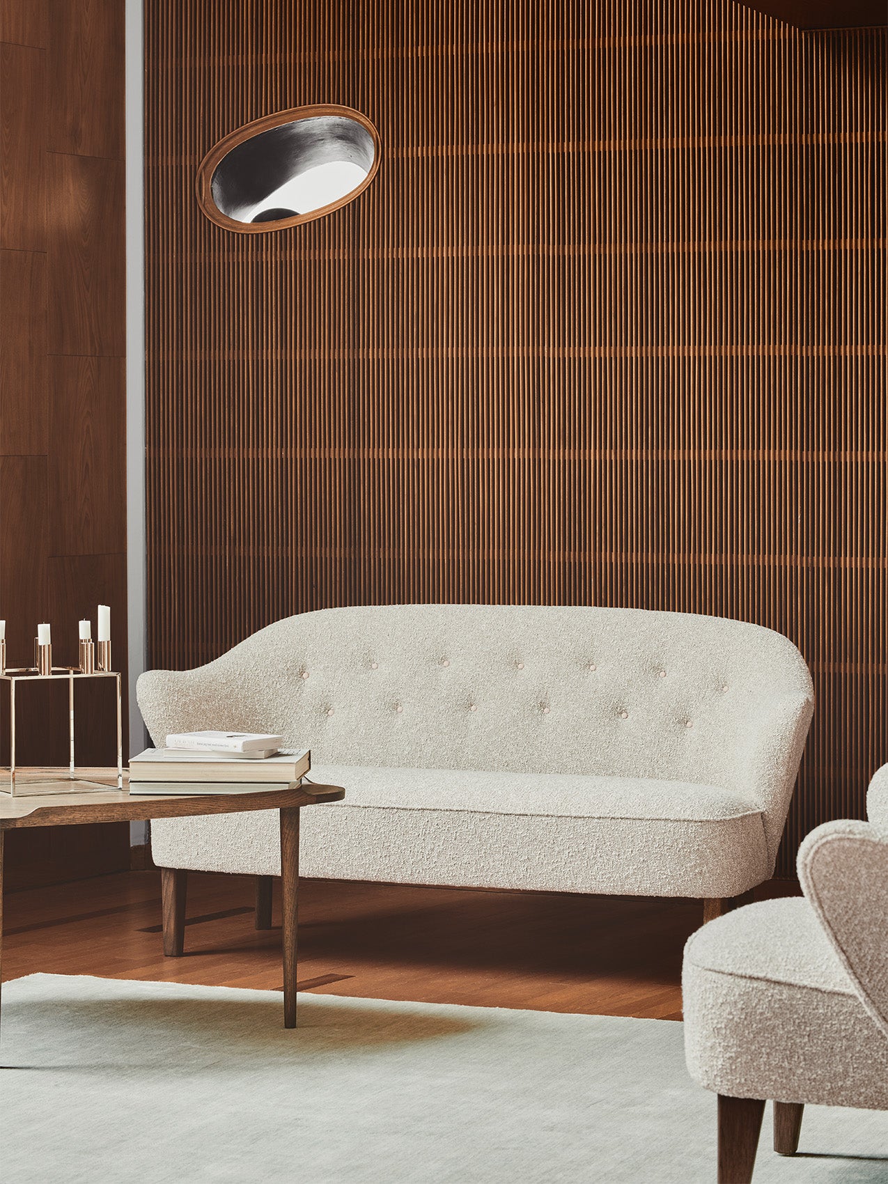The Ingeborg sofa, an elegant 2.5-seater, was originally designed by Flemming Lassen in 1940 but never widely produced. Recently rediscovered in the archives, it has gained immense popularity among modern design enthusiasts after being meticulously recreated from original sketches. Featuring characteristic armrests, a buttoned back, and wooden legs, this deceptively spacious design is visually stunning and offers comfortable seating. Mirroring the expression of the corresponding chair, these two designs create a cozy and embracing duo that complements any contemporary living space. The Ingeborg Sofa comes in various exquisite upholstery fabrics, while the legs are available in oak or smoked oak options.