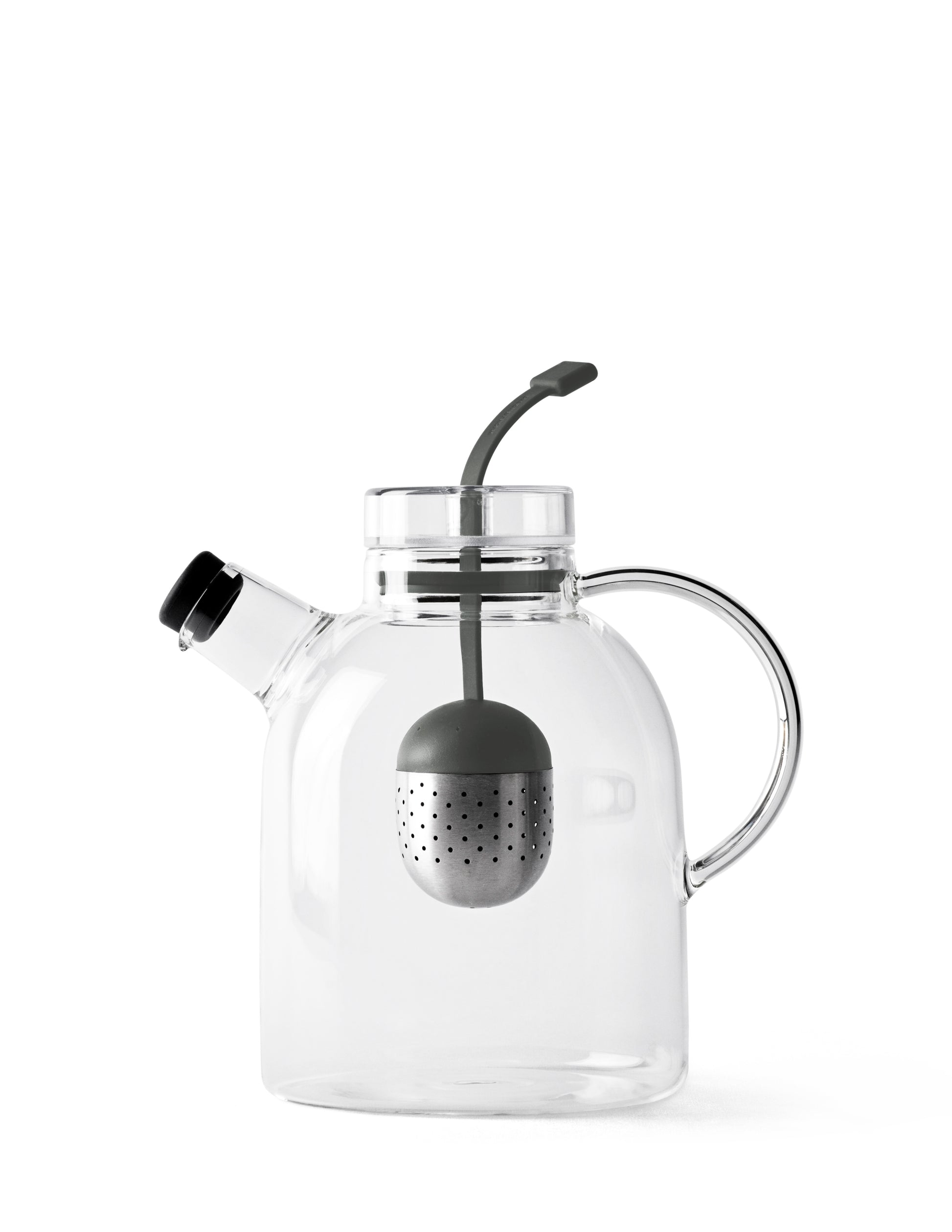 Glass teapot with tea infuser that hangs by a grey silicone string, serving as a stylish teabag in the middle of the teapot. The pot can contain 1,5 liter. Inspired by classic, Oriental teapots – in a harmonic fusion with modernistic, Scandinavian design.