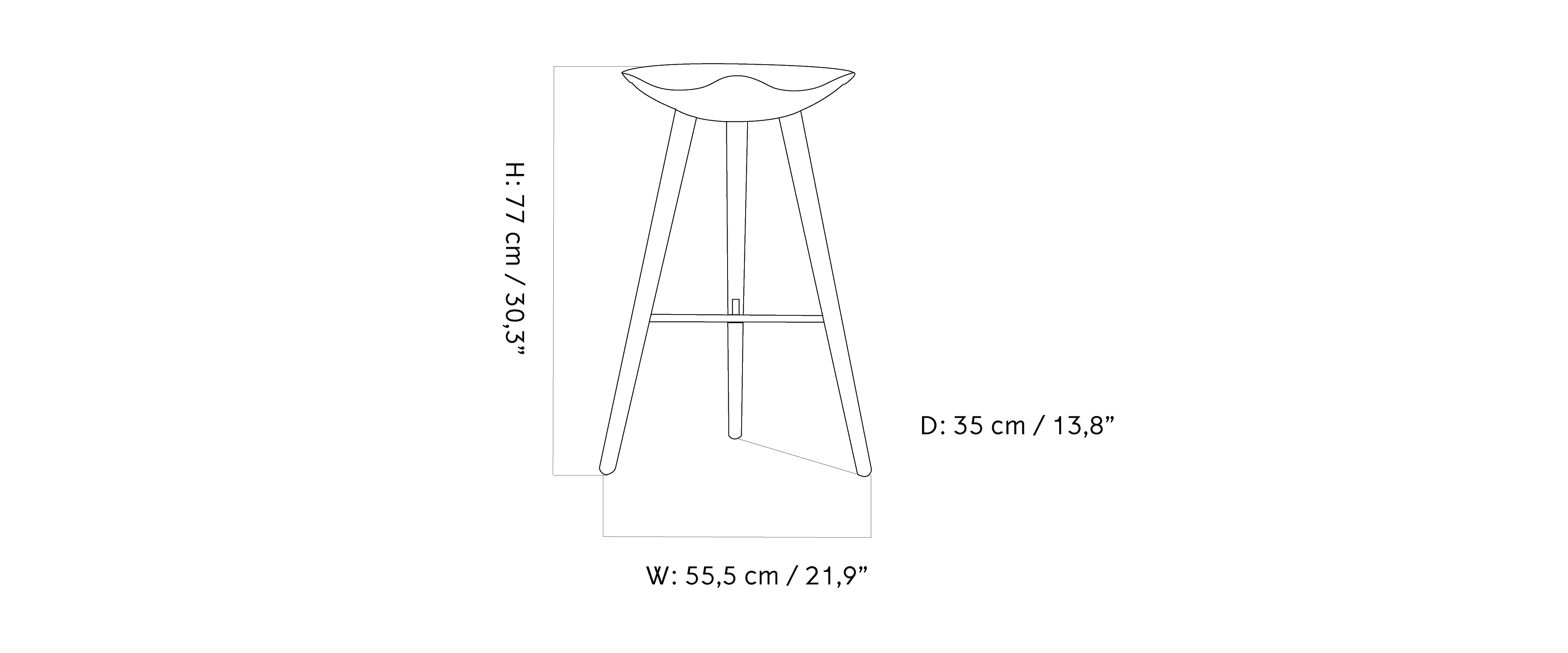 When Mogens Lassen wanted to create a stool that was an extension of the body, he looked to those used by shoemakers, transferring their light and elegant look to his sculptural three-legged design. Now considered a collector’s item, the ML42 was first designed in 1942. Shaped from wood to support the body, it is offered in three different heights, each featuring a moulded seat and tripod-like legs. The addition of a metal foot bar on the bar and counter versions ensures further comfort when seated for extended periods. Lightweight and easy to move around, it is offered in black-stained beech, soap treated oak and brown-oiled oak.