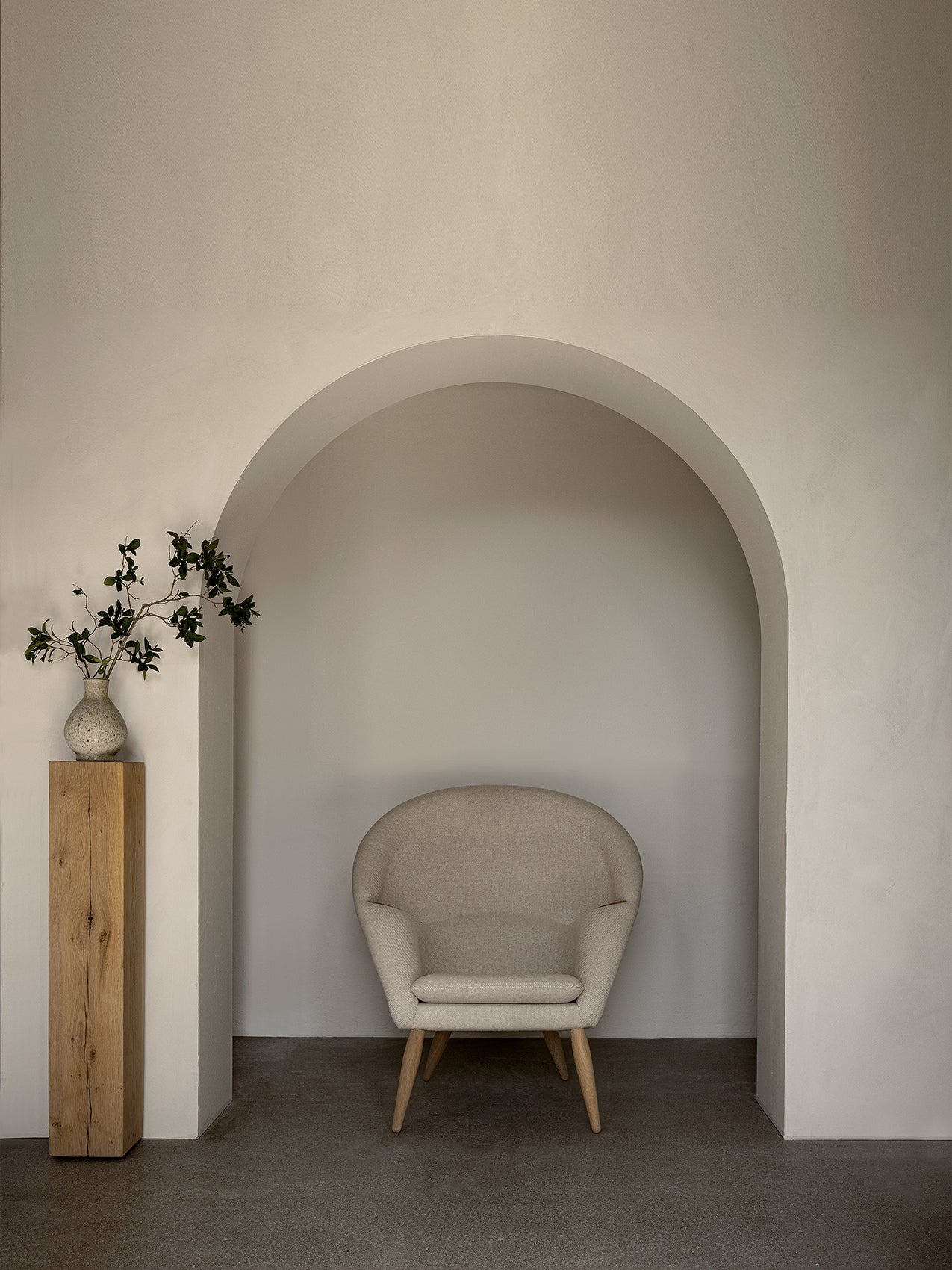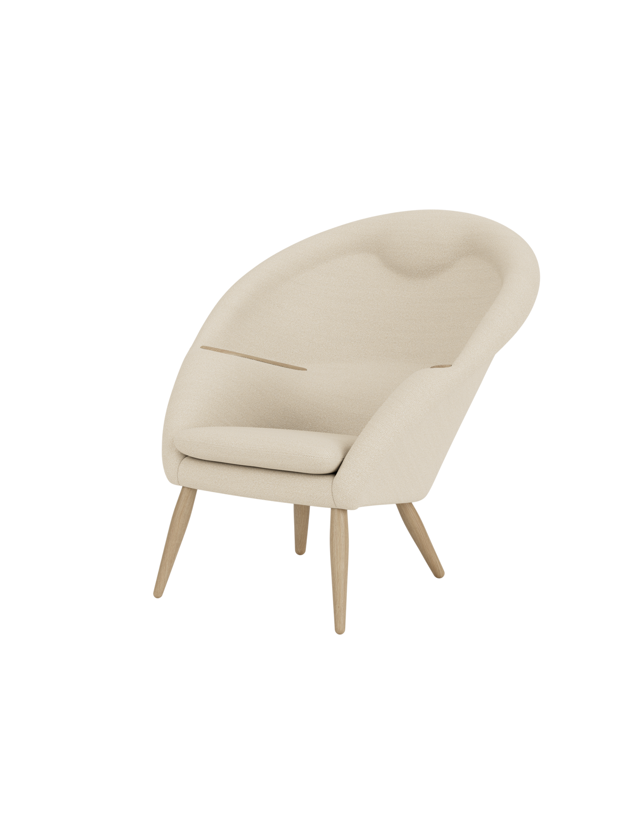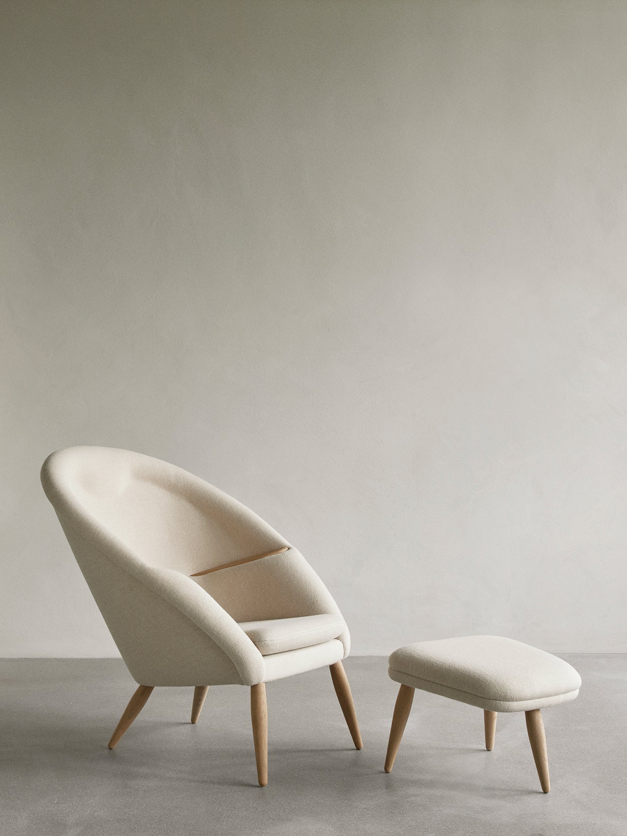 Originally dubbed Model 9, the Oda Chair was an ambitious design from the very beginning. Created by Arnold Madsen in around 1956, the aesthetic reinterpretation of an armchair has a complex horseshoe construction with an integrated headrest and beautifully incorporated armrests in wood. Offering comfortable support, the embracing design was initially – and mistakenly – attributed to Nanna Ditzel. In 2020 it was rightfully credited to Madsen. Constructed according to a vintage version as there are no drawings of the original design, the Oda Chair profiles a sublime level of craftsmanship, evident in the intricacy of its upholstery. Available with legs in natural oak or walnut.