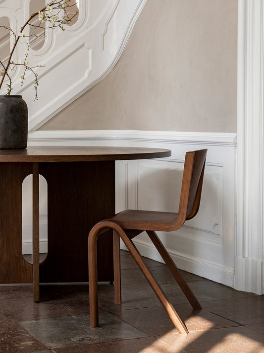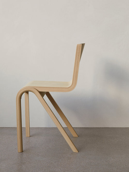 The result of a study of the possibilities of form-pressing techniques, Ready Chair, created for Audo by Matias Møllenbach and Nick Rasmussen, takes its cues from classic free-swing chair designs, its cantilevered seat and backrest appearing as if suspended on air. Available in oak veneer, it comes with a natural or red stained oak finish and with the option of an upholstered seat and back. Perfectly sized for use as a dining chair, its stackable design and row-connecting feature make it equally suited to a multitude of other uses.